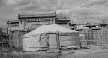 The Mongolian tents are circular, shaped like umbrellas, they are 4 or 5 meters in diameter and 3 meters high at center. The framework is formed by an assembly of movable wooden frames that can expand and contract at will. The roof is supported by ribs like a large umbrella. This frame is reminiscent of our chicken coops. A large hole is formed at the center of the rooftop, through which the smoke escapes.